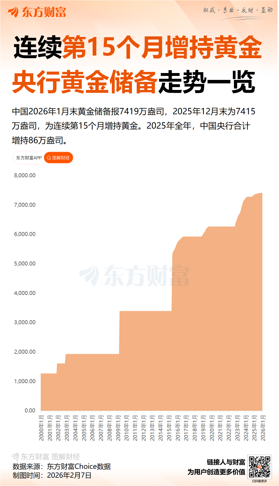 央行发布数据,中国 2026 年 1 月末黄金储备报 7419 万盎司,2025 年 12 月末为 7415 万盎司,为连续第 15 个月增持黄金。