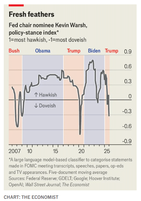 因此,沃什通常站在主张强力压制通胀的鹰派一边。《经济学人》 使用人工智能模型,将他近 200 次演讲、电视露面和研究论文置于 「鹰派-鸽派」 光谱上进行定位。在今年之前,他唯一转向鸽派立场的时期都是在严重的危机期间:2007-09 年的全球金融危机、新冠疫情以及 2023 年硅谷银行的倒闭。这种情况一直持续到特朗普赢得第二个任期。自那以后,他开始反复、强硬地呼吁降息,这与他年轻时的立场大相径庭。