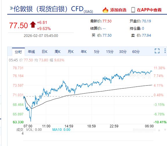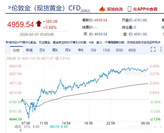 现货黄金涨 3.88%,报 4959.54 美元/盎司;现货白银涨 9.63%,报 77.50 美元/盎司。