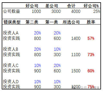 上述 4000 家公司中,「好公司」 有 1000 家 (25%),「差公司」 有 3000 家 (75%),你的判断准确率是 80%,意味着如果碰上一家好公司,你有 80% 的概率能识别出来并投资,只有 20% 判断失误,没有投资 (「第二类错误,概率 20%」);如果碰上个差公司,你有 80% 的概率能判断出来并排除掉,只有 20% 的概率判断失误,误以为好公司而投资了 (「第一类错误,概率 20%」)。