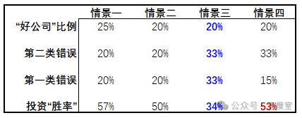 情景一就是书中案例的基础情况,情景二是只把 「基础概率」 做了调整,降低到只有 20% 的好公司比例,情景三就是上述假设,20% 的好公司,三次判断对两次……结果,胜率变成了 34%,也就是 「三次投资对一次」。