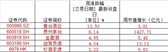 从白酒板块个股走势来看,皇台酒业冲高回落,周涨幅达到 13.5%;贵州茅台周涨幅达到 8.14%,周中市值一度突破两万亿元大关,本周市值增长 1427.71 亿元;此外,金徽酒、迎驾贡酒、珍酒李渡的周涨幅也均在 3% 以上。