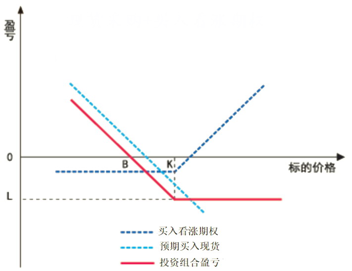 图为 「现货采购+买入看涨期权」 的组合 (L 为亏损,K 为行权价,B 为盈亏平衡点,下同)