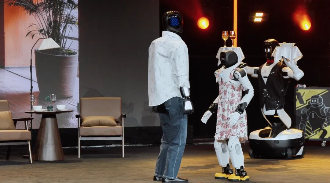 机器人语言类节目 《替身约会》 落地,多台机器人与开心麻花演员同台飙戏,同时依据场景做出 「害羞」「困惑」 等拟人化动作,幽默探讨 「机器人的爱情」。