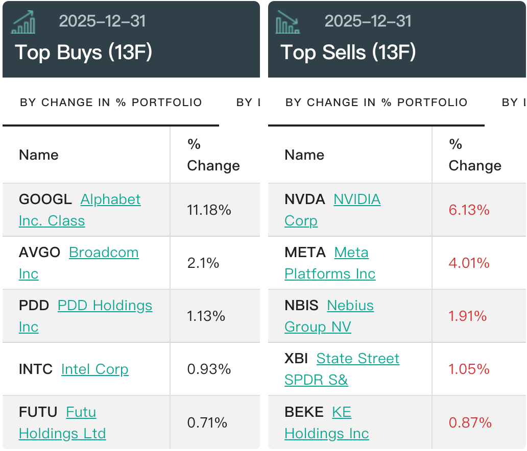 增减持方面,除谷歌之外,景林香港公司还在 2025 年四季度增持了拼多多、富途控股、英特尔、华住集团等股票,新建仓博通;除减持英伟达、Meta 之外,景林香港公司还在 2025 年四季度减持了贝壳、联合健康、台积电等股票。