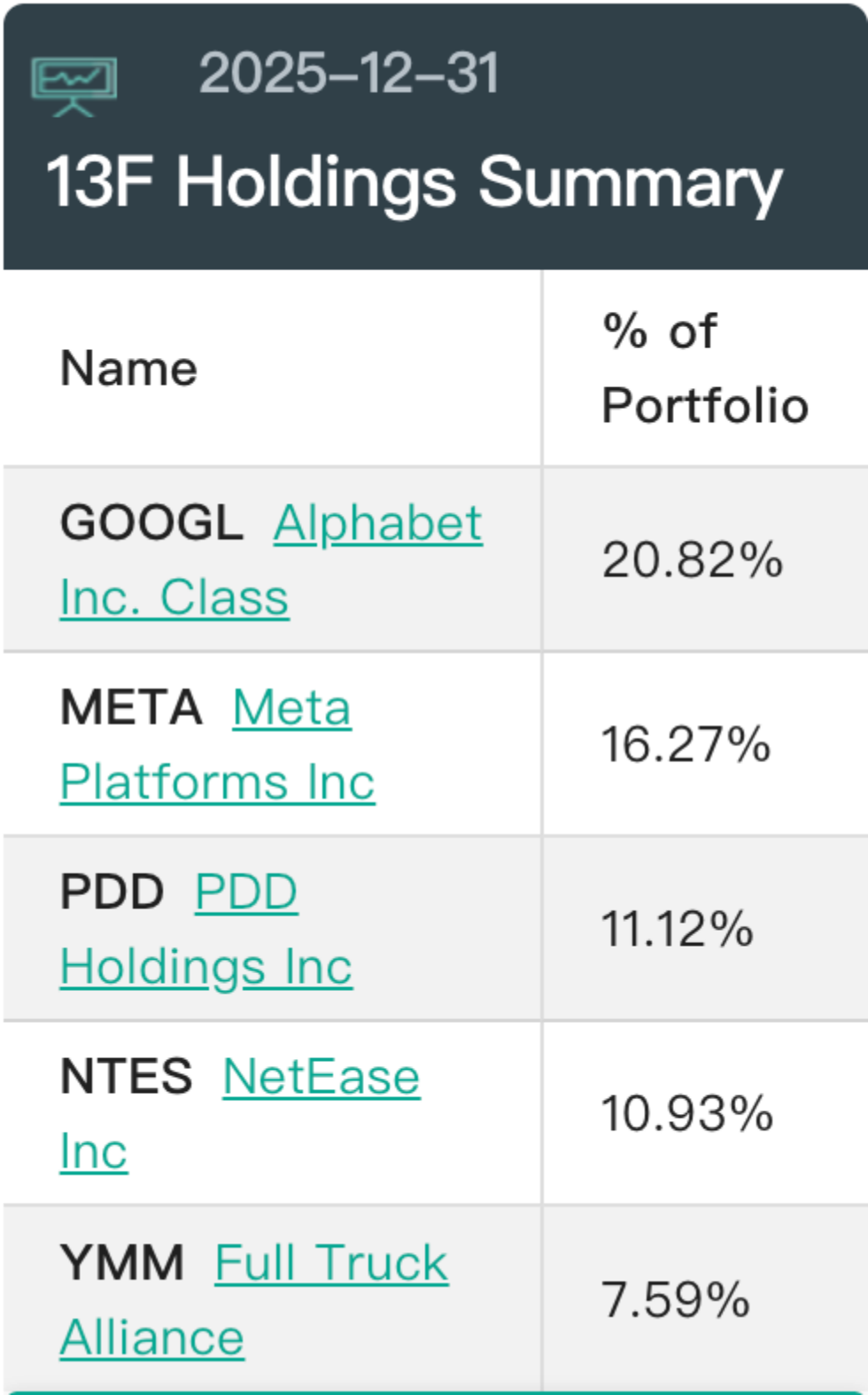截至 2025 年年末,景林香港公司的前五大重仓股分别为谷歌-A、Meta、拼多多、网易、满帮集团。而 2025 年三季度末的前五大重仓股则分别为 Meta、网易、英伟达、拼多多、谷歌-A。