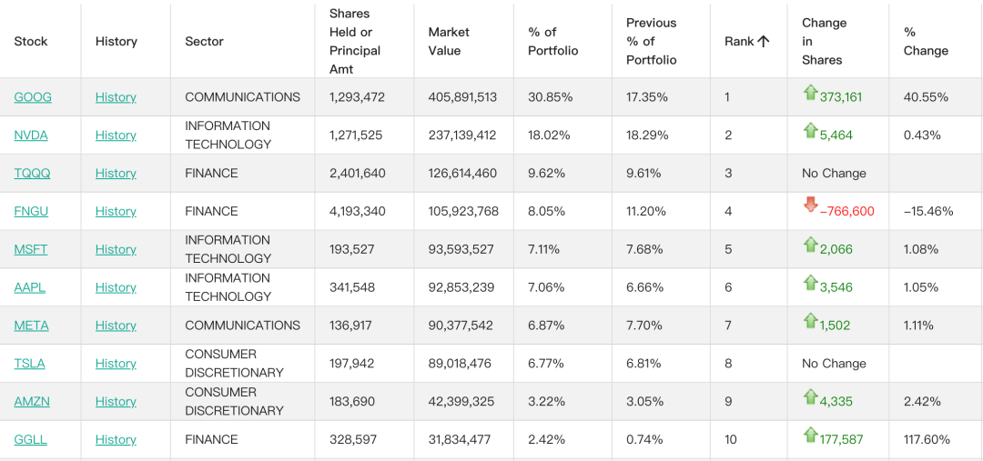 其中,谷歌-C 在 2025 年三季度末是东方港湾在美股的第二大重仓股,2025 年第四季度增持比例超 40%,成为截至 2025 年末的第一大重仓股,仓位占比高达 30.85%。同时,东方港湾在 2025 年第三季度就建仓了 2 倍做多 GOOGL-Direxion,在 2025 年第四季度继续大幅加仓,通过杠杆进一步提升谷歌的仓位。