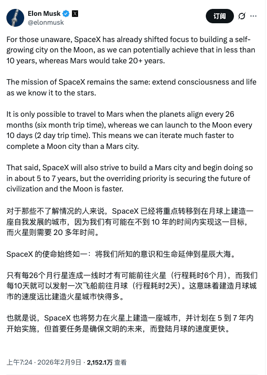 他在自己的 X 社交媒体平台上写道,SpaceX 仍计划在 5 至 7 年内启动其长期以来建设火星城市的雄心,「但最优先的任务是确保文明的未来,而月球的进展速度更快」。