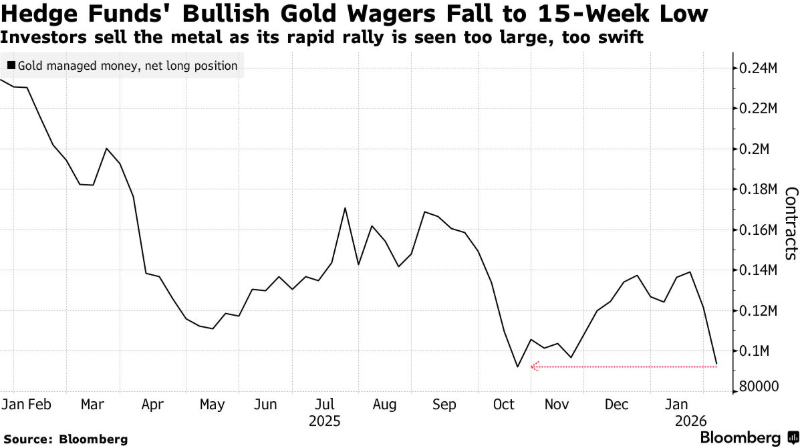 截至 2 月 3 日当周,对冲基金和其他大型投机商将黄金的净多头头寸减少了 23%,至 93438 份合约。美国政府上周五公布的数据显示,这一水平为 15 周以来的最低水平。