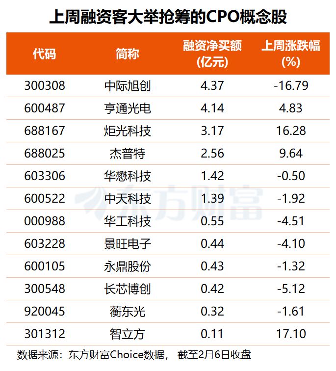 上周,CPO 概念板块经过周二大涨后持续走低,周跌幅达 1.63%,不过仍有多只概念股获得杠杆资金青睐。