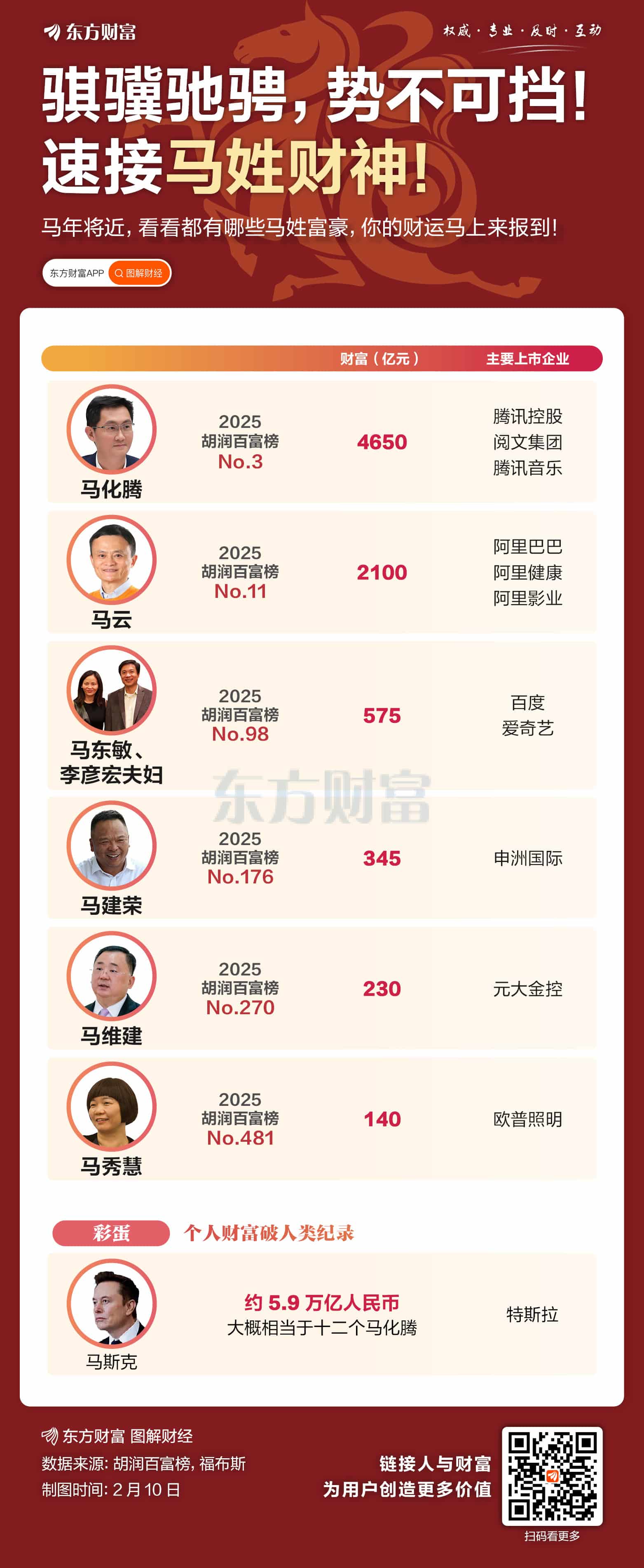 马年将近,我们就来盘点一下马姓富豪的财力。《2025 胡润百富榜》 排名前 500 的富豪中,姓马的有 6 位。分别是腾讯的马化腾、阿里巴巴的马云、百度李彦宏的太太马东敏、申洲国际的马建荣、元大的马维建、欧普照明的马秀慧。