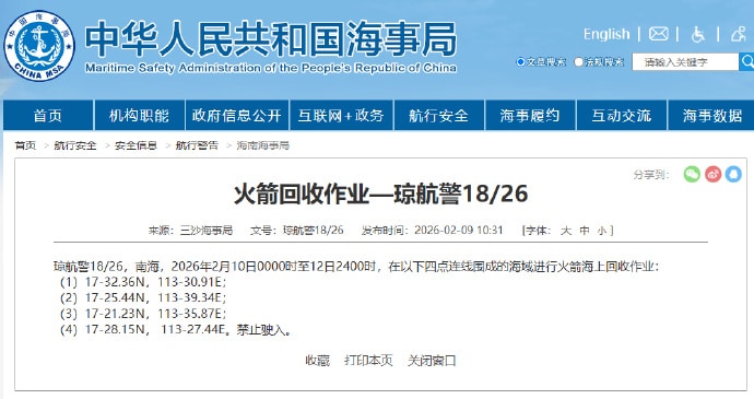 据中国海事局网站消息,三沙海事局发布航行警告,2 月 10 日 0 时至 12 日 24 时,南海部分海域进行火箭海上回收作业,禁止驶入。