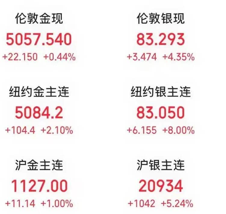 内盘方面,昨日沪金期货主力合约收涨 3.88%,沪银期货主力合约收涨 8.9%。夜盘时段,沪银期货主力合约收涨 5.24%。