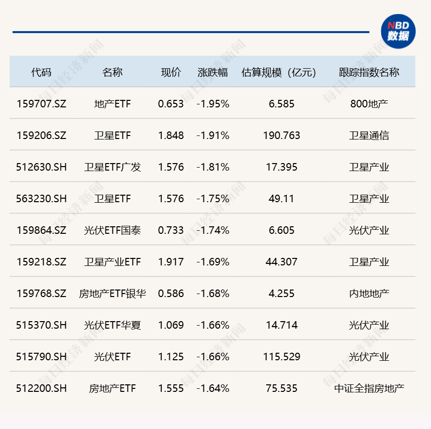 下跌方面,地产、卫星相关 ETF 跌近 2%。