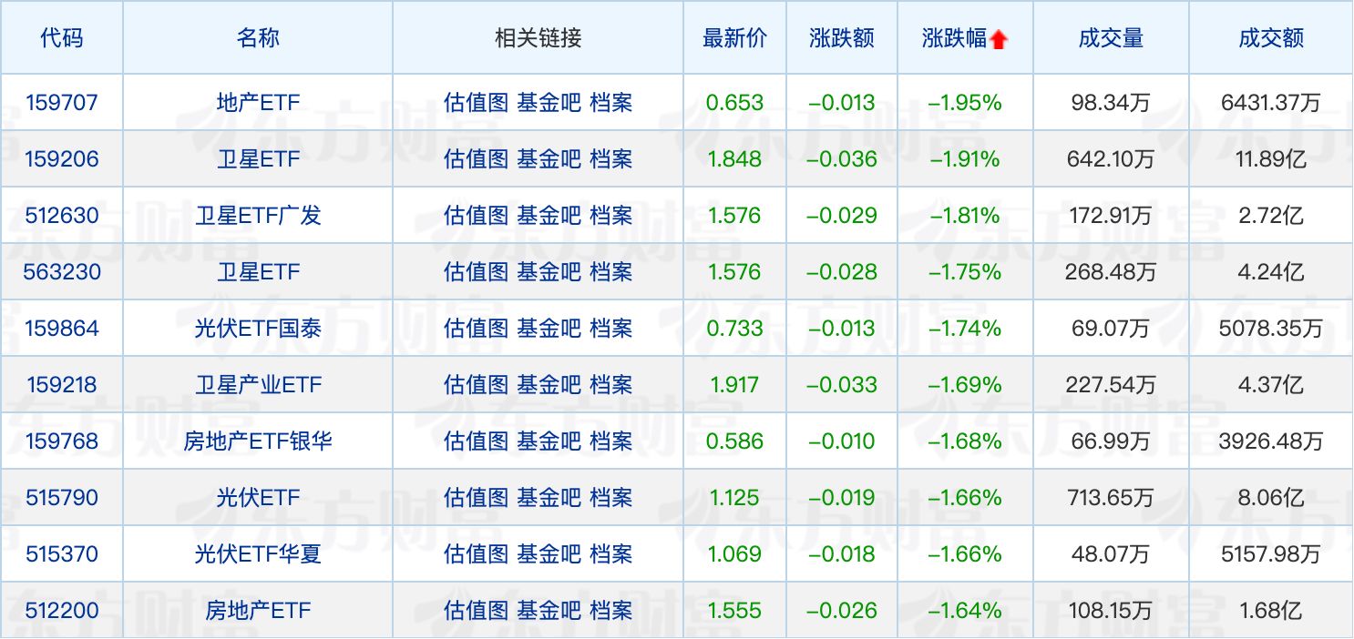 下跌方面,地产、卫星相关 ETF 跌近 2%。