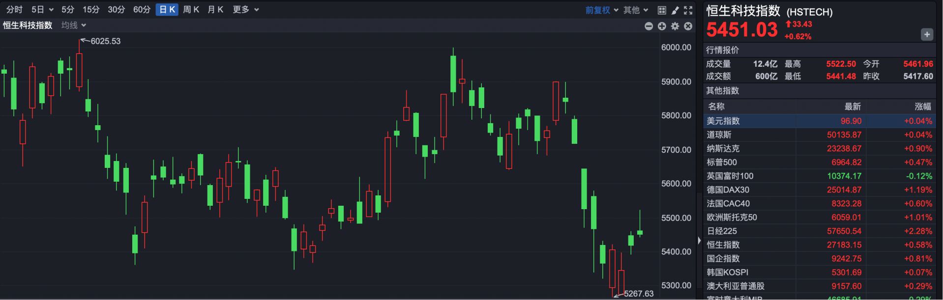恒生科技指数收盘报 5451.03 点,上涨 33.43 点,涨幅 0.62%。