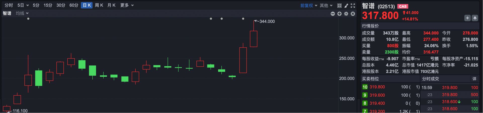 市场热点方面,AI 应用股大涨,智谱 (HK02513) 涨超 14%,创上市以来新高。