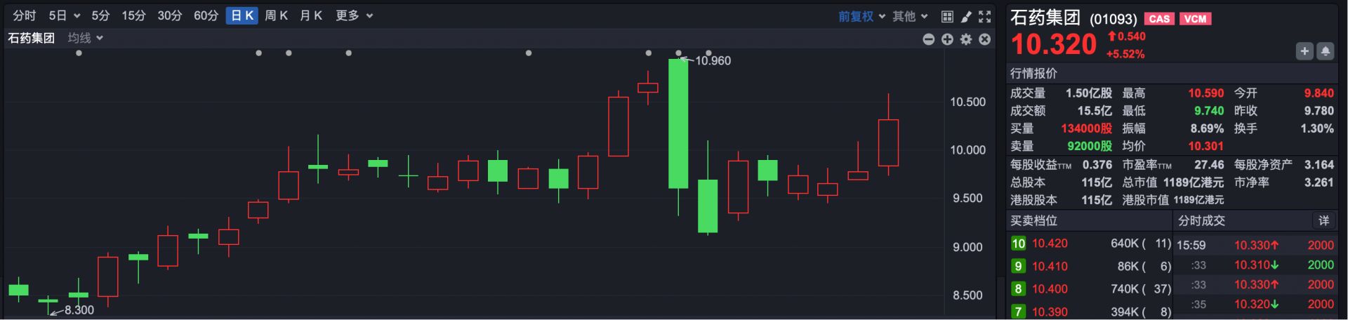 创新药概念股集体上涨,石药集团 (HK01093) 涨超 5%,信达生物 (HK01801) 涨超 4%,荣昌生物 (HK09995) 涨超 3%。