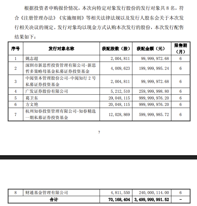 来源: 界面新闻 2月10日晚间,江淮汽车披露定增发行情况报告书,公司向姚志超、葛卫东等8名投资者合计发行了7016.84万股股份,发行价格为49.88元/股,募集资金总额为约35亿元。其中,私募大佬葛卫东耗资约10亿元认购了2004.81万股。本次向特定对象发行股票完成后,发行对象所认购的股份自发行结束之日起六个月内不得转让。(界面新闻) 文章转载自东方财富