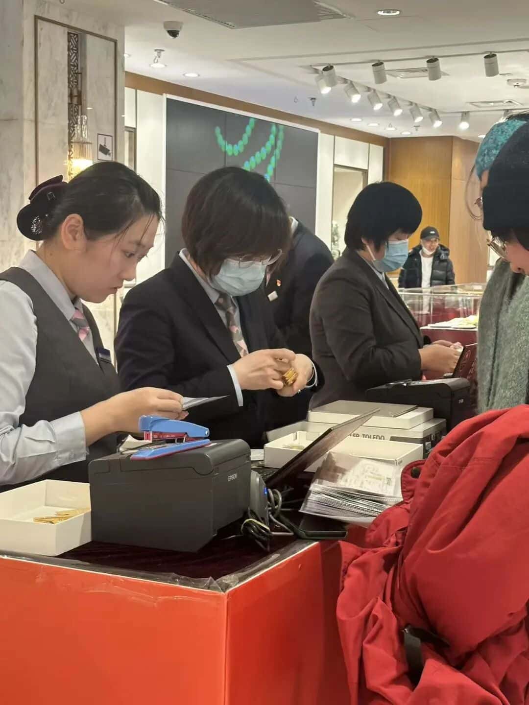 与投资金条的火爆场面相比,金饰窗口要冷清不少。很多金饰消费者转向了投资金条,一位年轻人告诉记者,自己之前就打算好了,年底发了奖金给老婆买个金手链,现在发现直接买根金条更拿得出手。一位古稀之年的老奶奶则一次性购买了 5 根 20 克的投资金条,「前几年我都是买黄金饰品给孙子、孙女当压岁钱,现在感觉直接买金条更合适。」
