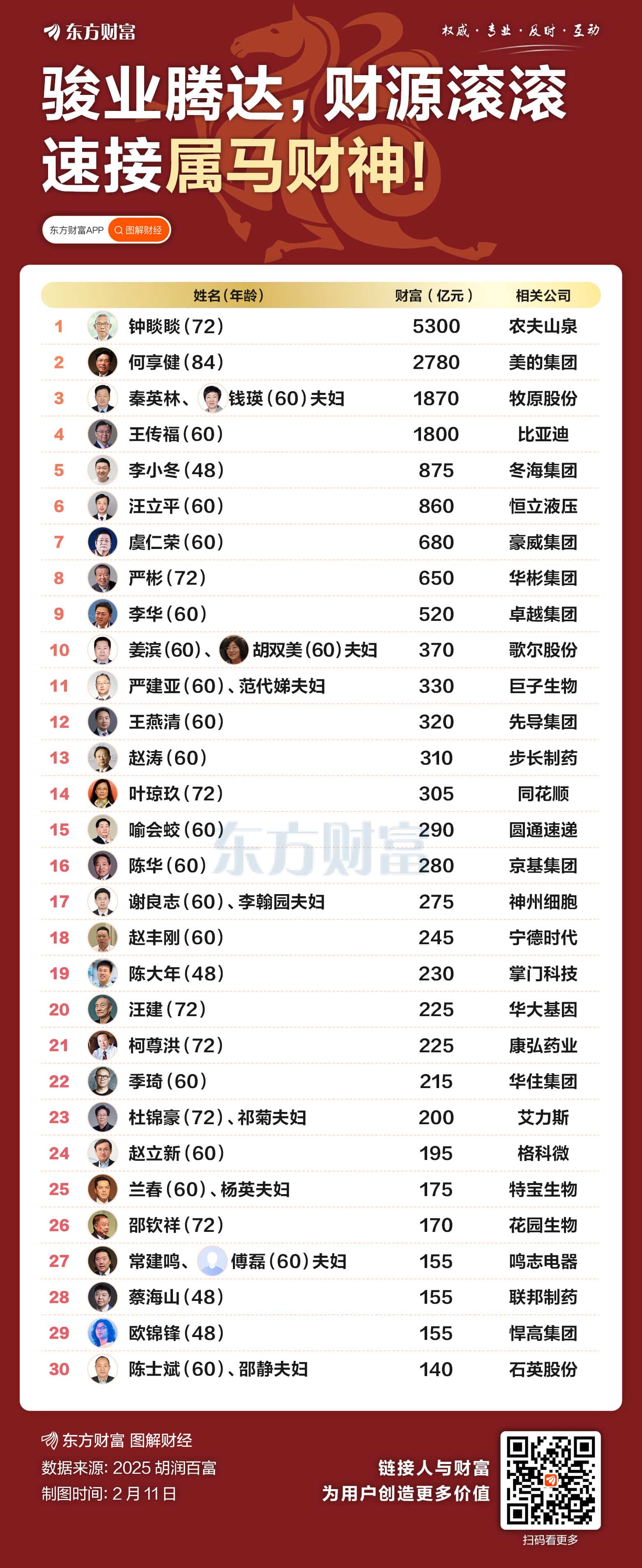 马在中国传统文化中寓意丰富,主要象征力量、速度、忠诚、进取精神与吉祥福运,而国内属马的企业家也不少。以出生年筛选 《2025 年胡润百富榜》 前 500 位的富豪,属马的有 30 位,其中有不少耳熟能详的名字,比如中国首富、农夫山泉钟睒睒 (1954 年生),还有美的何享健 (1942 年生)、华彬集团严彬 (1954 年生)、比亚迪王传福 (1966 年生)、豪威集团虞仁荣 (1966 年生)、歌尔股份姜滨 (1966 年生) 等,都是属马的。